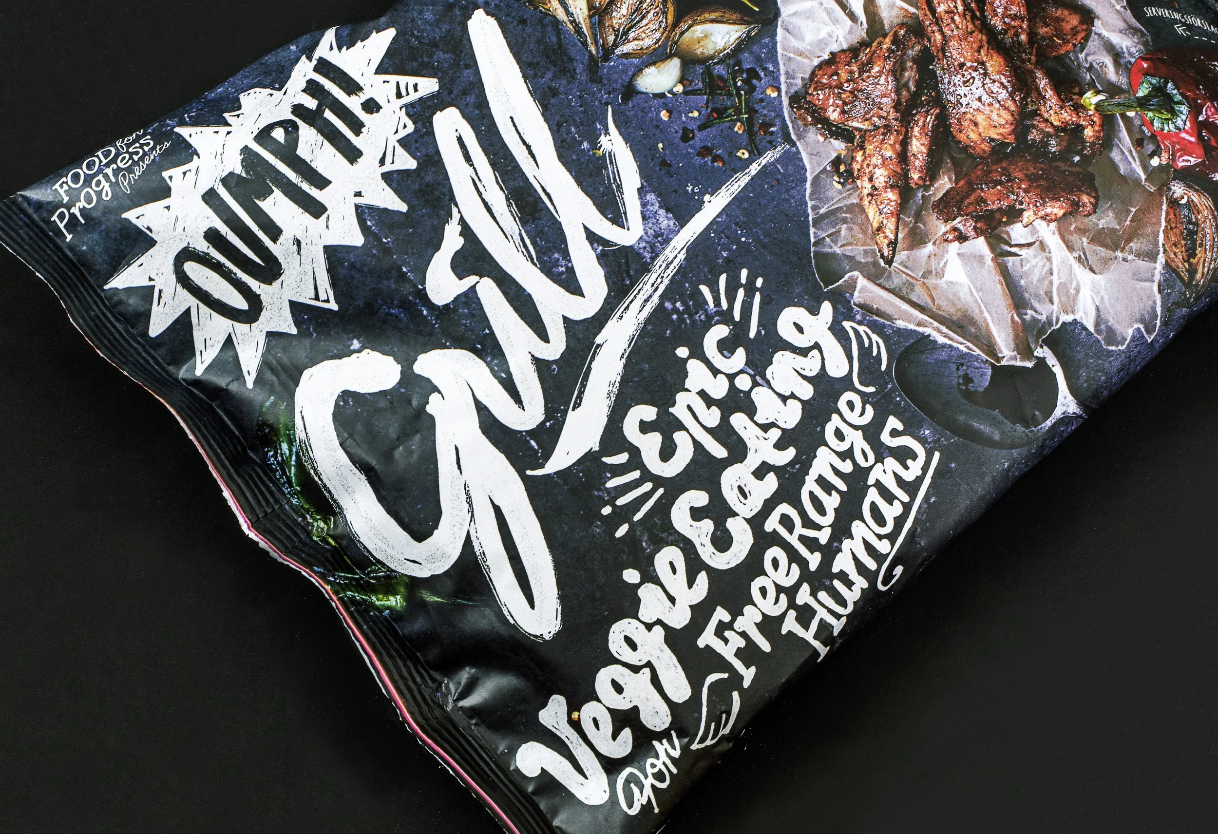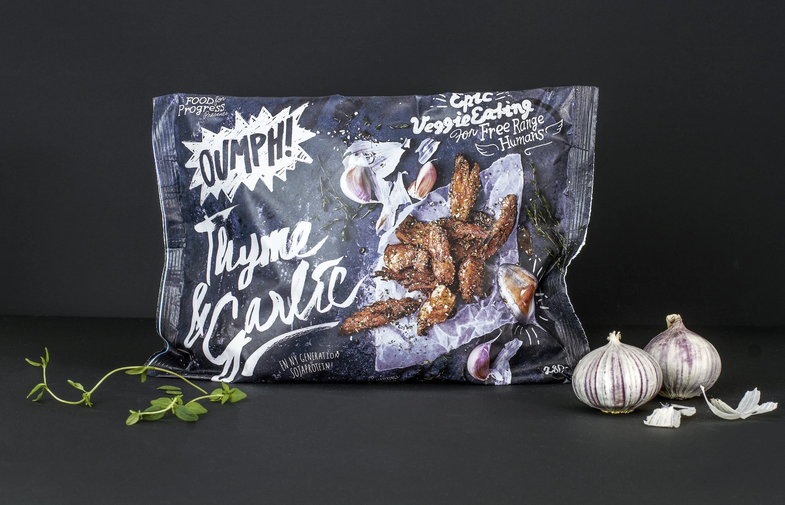 When creating the brand identity and packaging design for Oumph!, the strategy and goal were to avoid the visual clichés often associated with vegetarian food. Back in 2015, most competitor brands looked the same, and Oumph! had a revolutionary impact on the frozen food aisles of Swedish supermarkets. The black-and-white, entirely hand-painted identity was inspired by DIY food culture — food trucks and chalkboards — and we wanted Oumph! to feel like a punch in the face: bold, crafty, and inspiring people to join the movement of choosing good, all-vegan food.